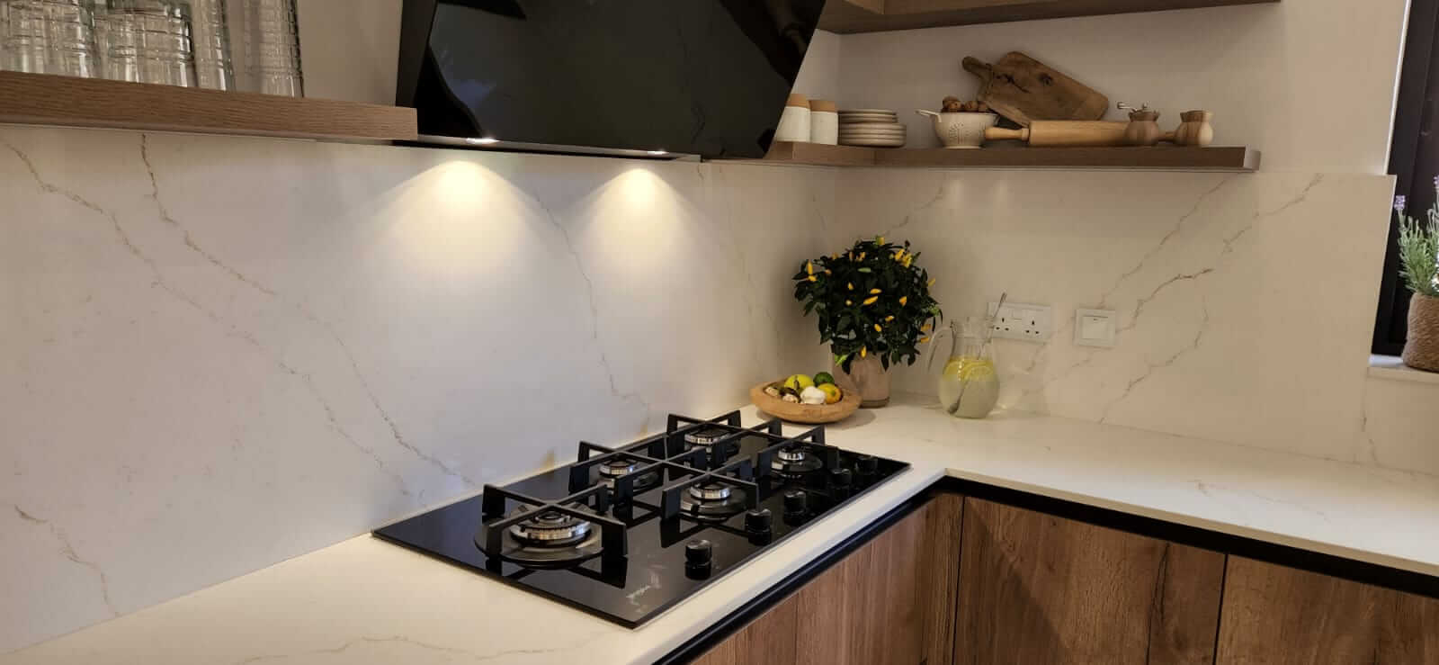 The kitchen features white quartz surfaces with delicate brown veining, covering both the countertops and the central island. Each piece was cut precisely using our own machinery and meticulously finished, ensuring flawless edges and seamless surfaces.