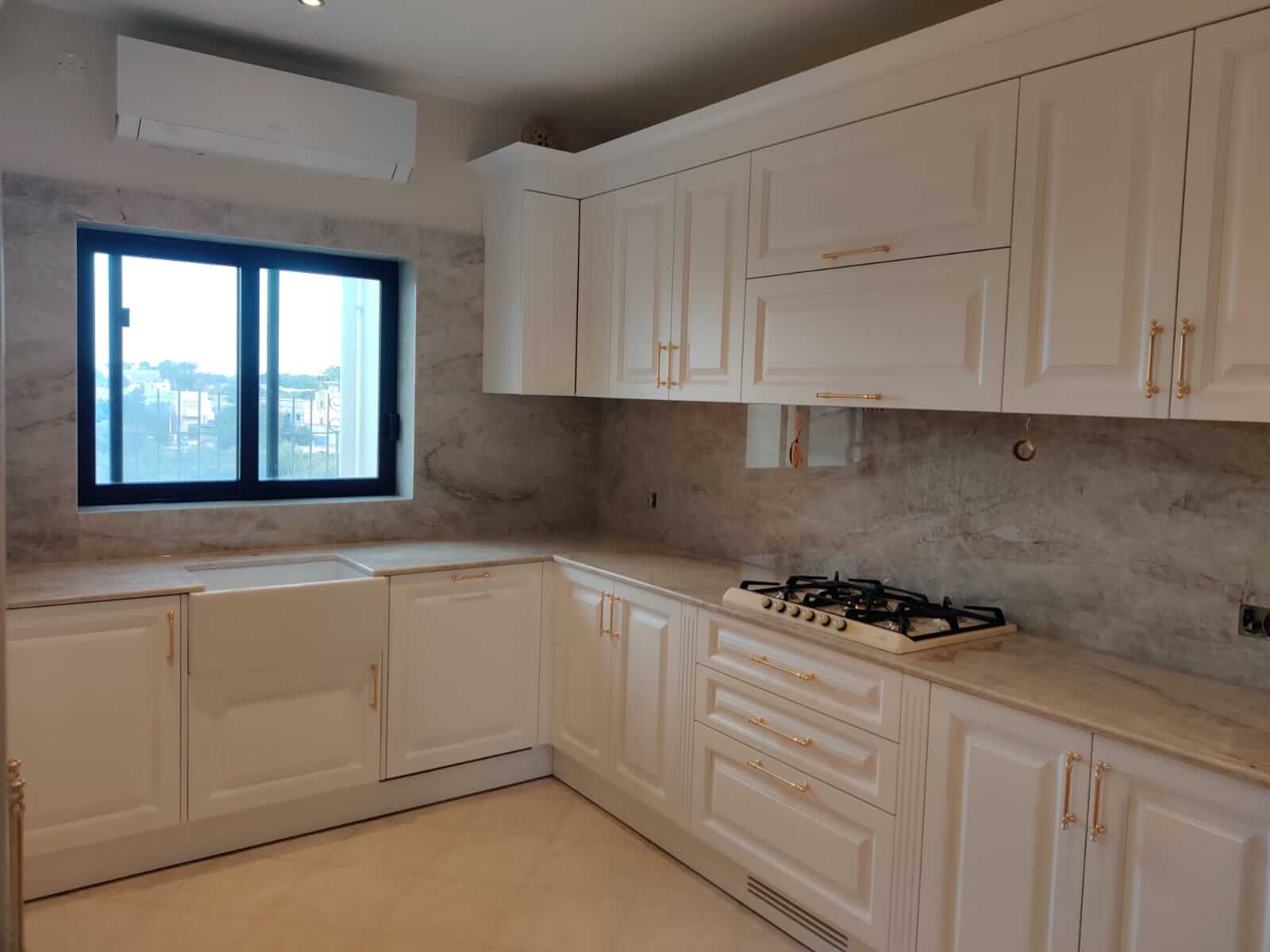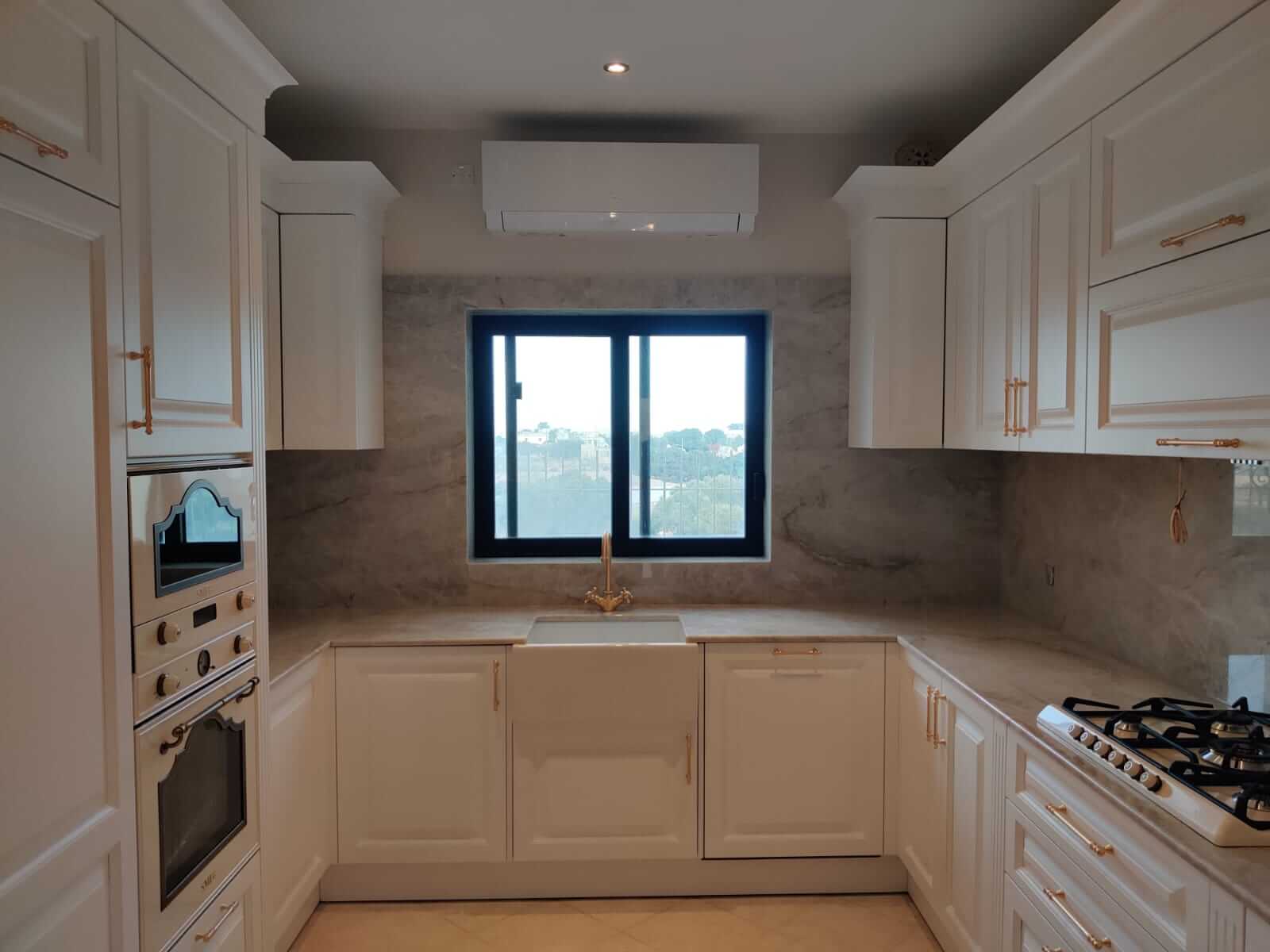 In this elegant white kitchen, Classic Taj Mahal quartzite has been chosen for the countertops and splash-backs, bringing a touch of warmth and timeless sophistication to the space.